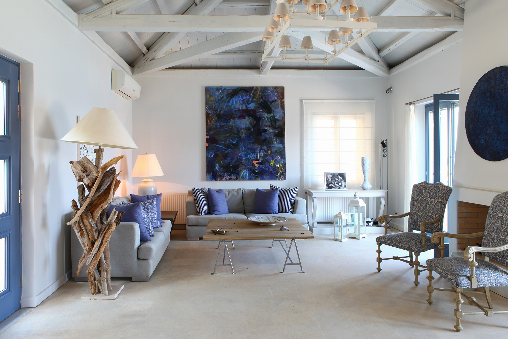 Perched above the pristine waters of Gialia Bay on the lush island of Andros, just two hours from Athens, this exclusive estate features two elegant villas designed in classic neoclassical style. With a total of 10 beautifully appointed bedrooms, Double Two comfortably accommodates up to 20 guests. The estate offers sweeping sea views and private access to a secluded beach. Highlights include a swimming pool, tennis court, and a stunning shaded lounge built into the natural rock. Ideal for large families or groups, this private retreat blends designer interiors with Cycladic charm for a truly luxurious island escape.