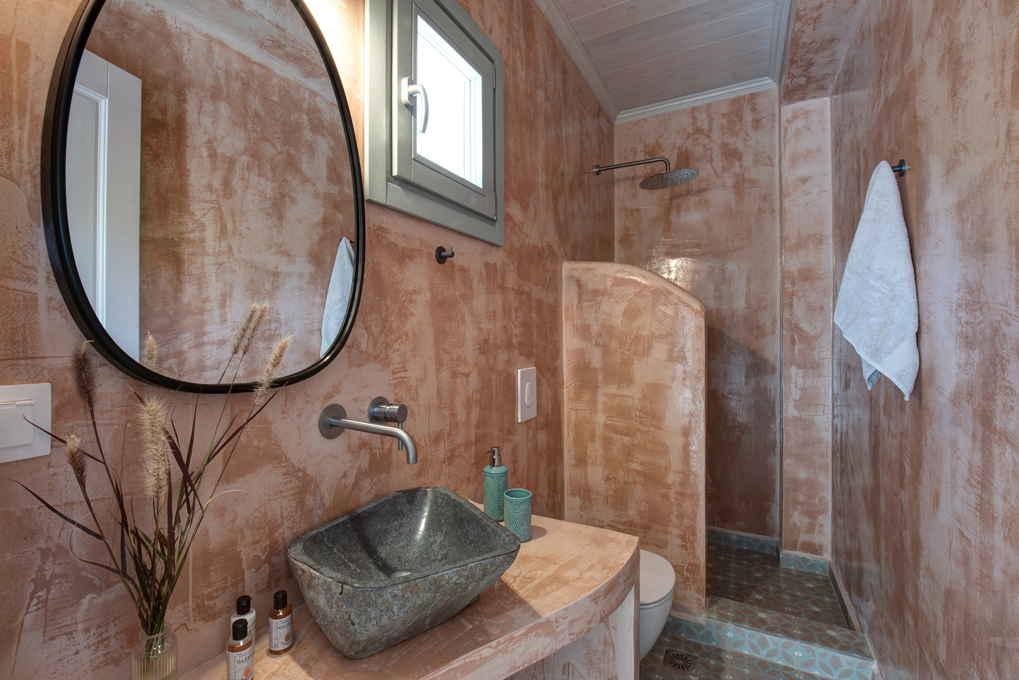 On the second level there is a house with two bedrooms, 2 bathrooms, a kitchen (indoor dining seats 6 guests), a living room and a terrace with a sea view.